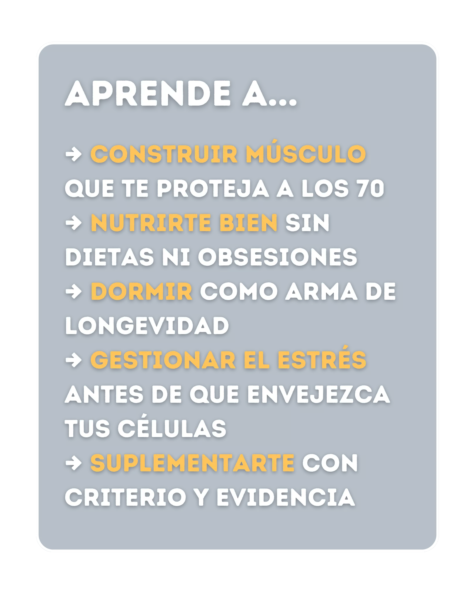Este ebook es una extensión de ese propósito: una guía completa y basada en ciencia sobre los cinco pilares que determinan cómo envejeces, para que puedas tomar decisiones informadas y construir una vida más larga y más saludable.